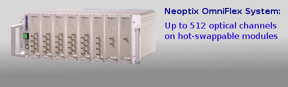 The OmniFlex System allows using various types of modules in the same chassis. These modules, called OmniModules, can easily be swapped between chassis to match the needs of specific projects in your laboratory or testing facility. Multiple chassis can be cascaded together to form an array of up to 512 optical channels. The system can also be upgraded to a maximum of 512 channels. OmniModules are available with one, two and four optical channels providing direct measurement at a rate of 6 Hz per channel. OmniModules are also available with 4 or 8 channels that are multiplexed at a rate of 250 ms between channels.