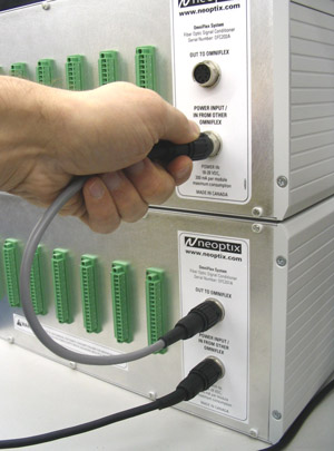Connect two OmiFlex chassis together using that interconnect cable. Power and communication is transferred from one chassis to the other. Up to six chassis can be cascaded using only one power supply (Refer to OmniFlex Operating Manual to determine the exact number of chassis)