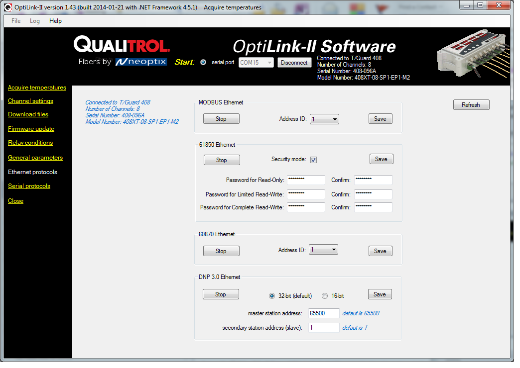 - Serial communication: RS-485, IEC 61870, MODBUS and DNP3